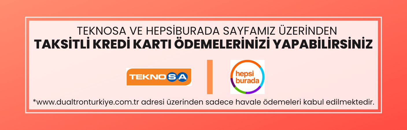 www.dualtronturkiye.com üzerinden havale ödemelerinizi gerçekleştirebilir, dilerseniz kredi kartına taksitli alışverişlerinizi 'Kategori' kısmında göreceğiniz TEKNOSA ve HEPSİBURADA sayfalarımız üzerinden de yapabilirsiniz!